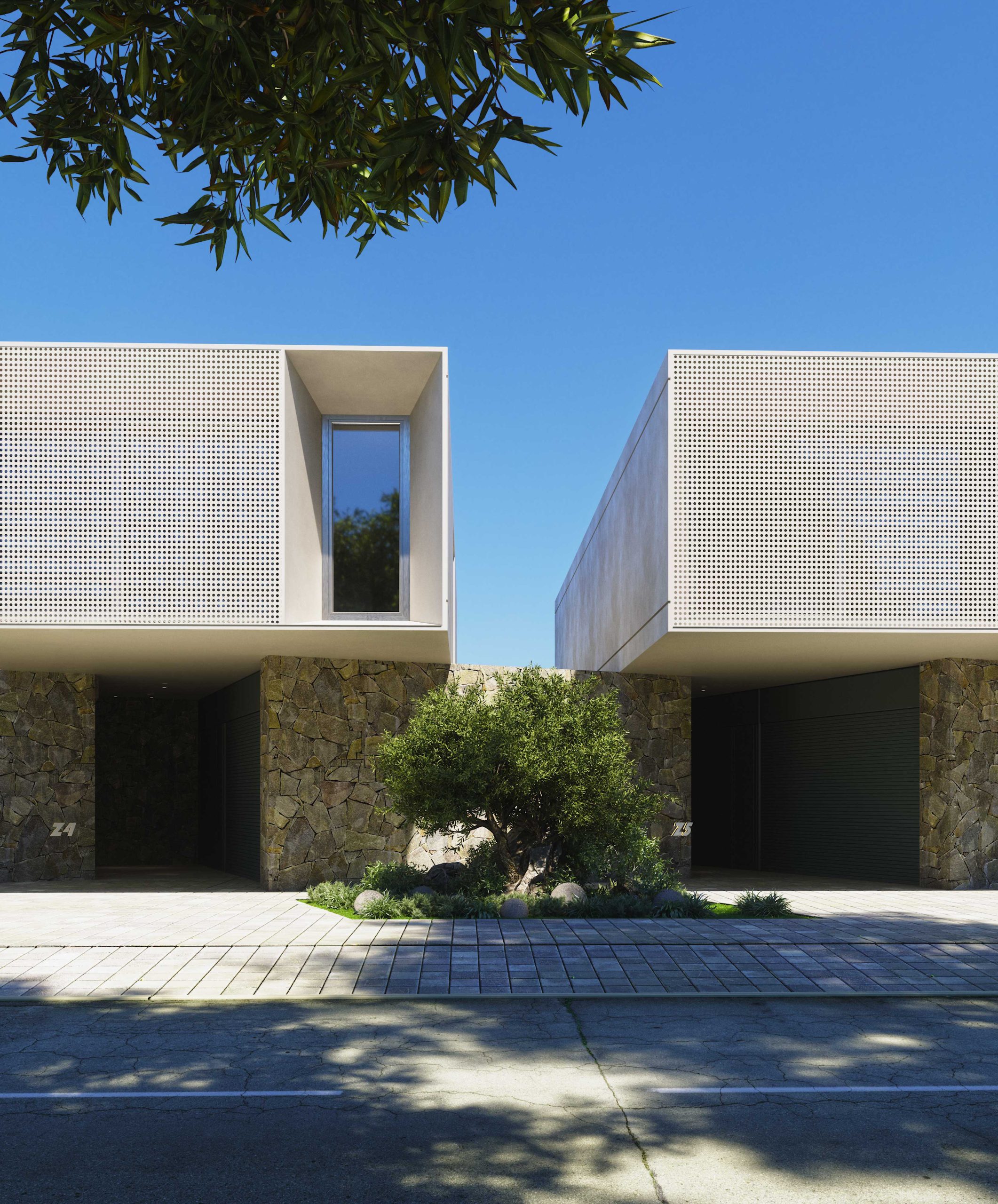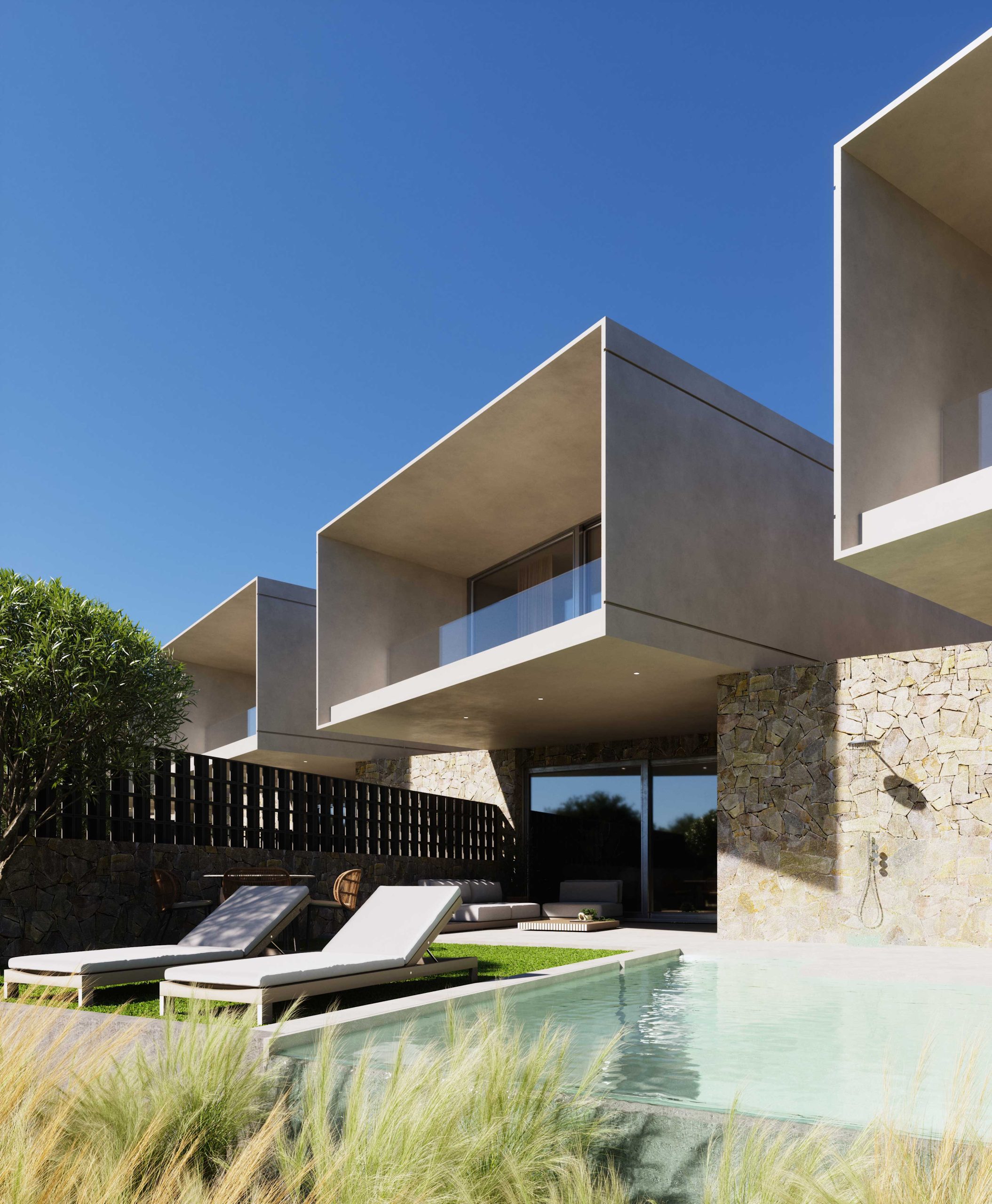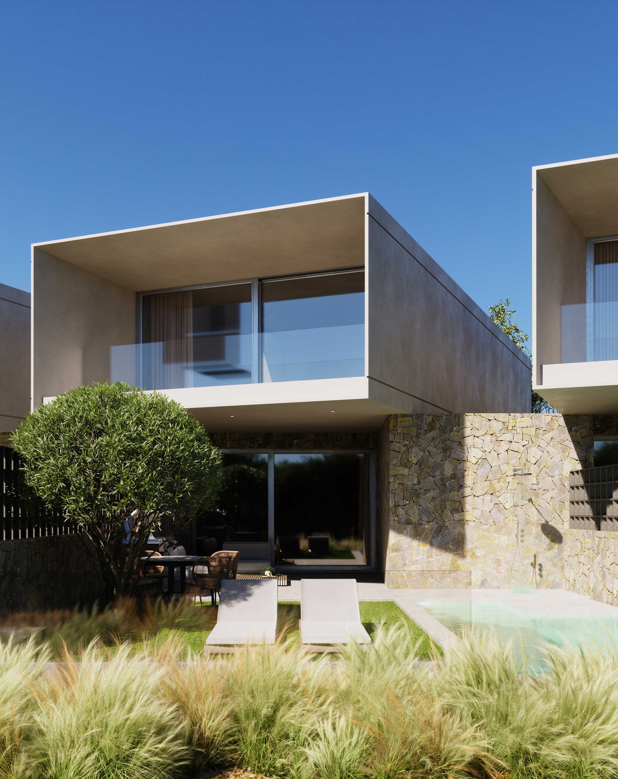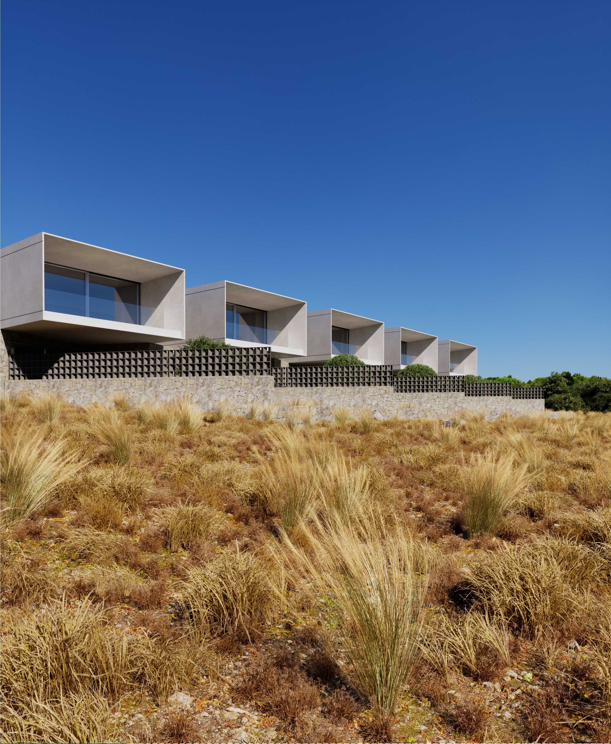 The project consists of a residential complex of five independent, two-storey houses with a minimalist design, arranged in a fragmented layout in Halkidiki, in close proximity to the sea. The ground floor of each dwelling is formed by inclined stone walls, which act as a solid base for the upper level. The upper floor is conceived as a clean, orthogonal volume that “rests” on the stone structure below, reinforcing the contrast between the heavy, earthy materiality of the base and the light, restrained geometry of the superstructure.
