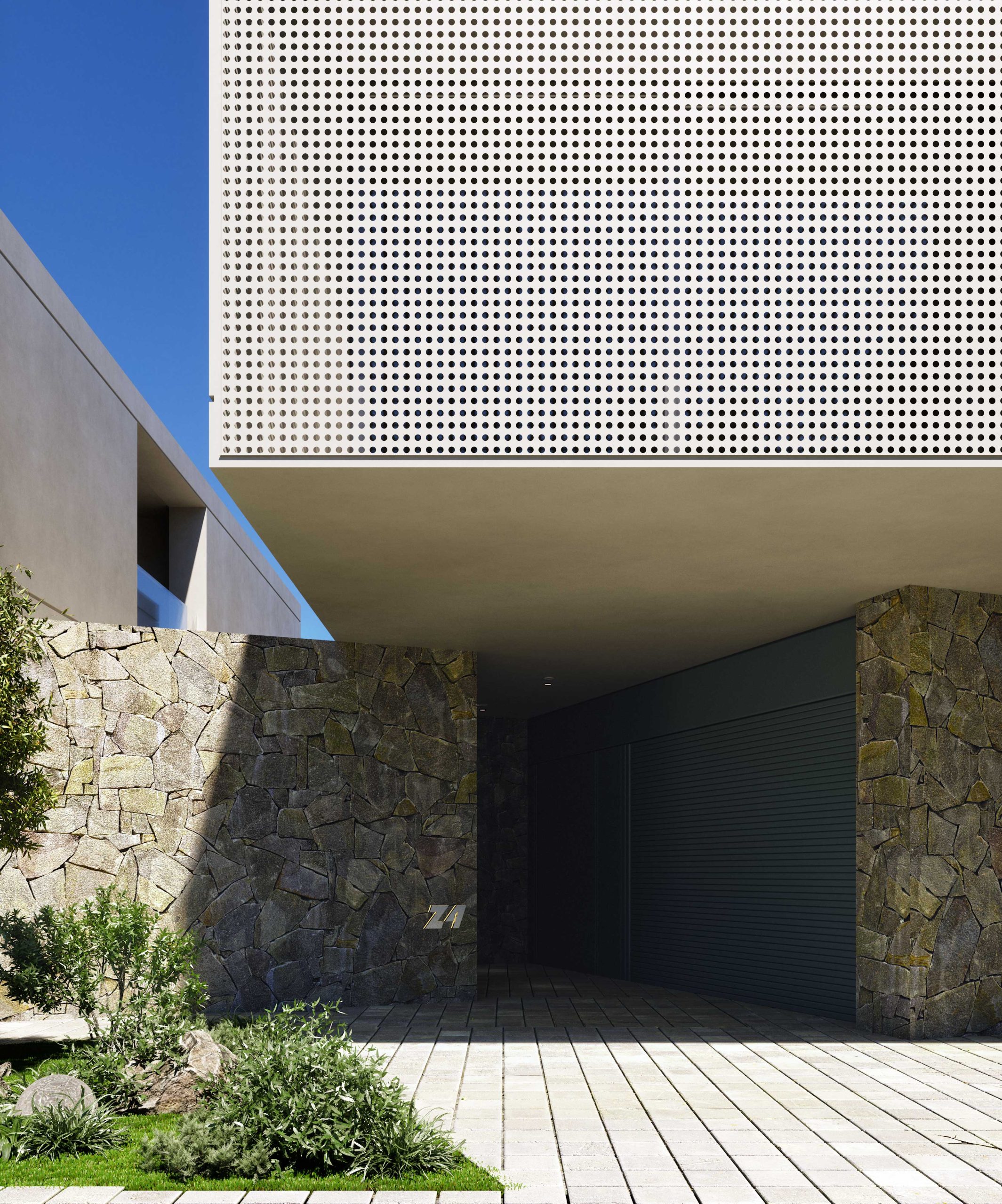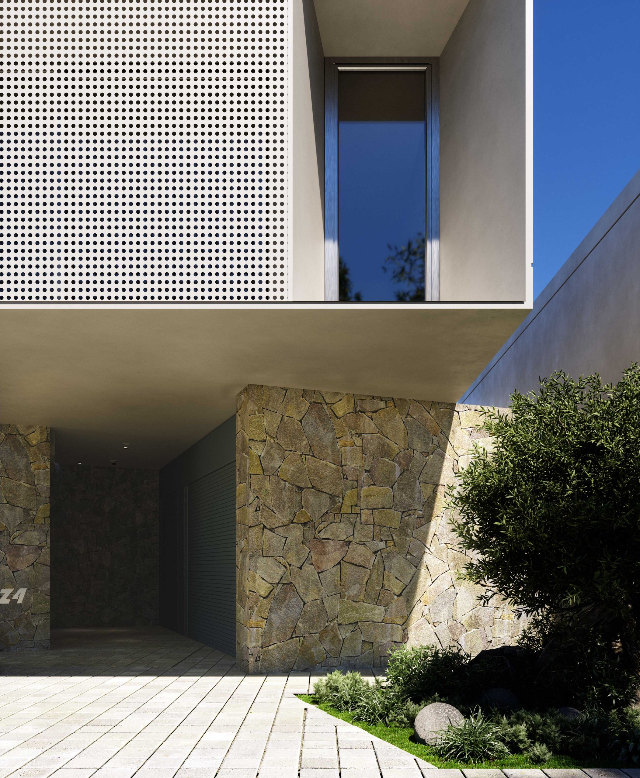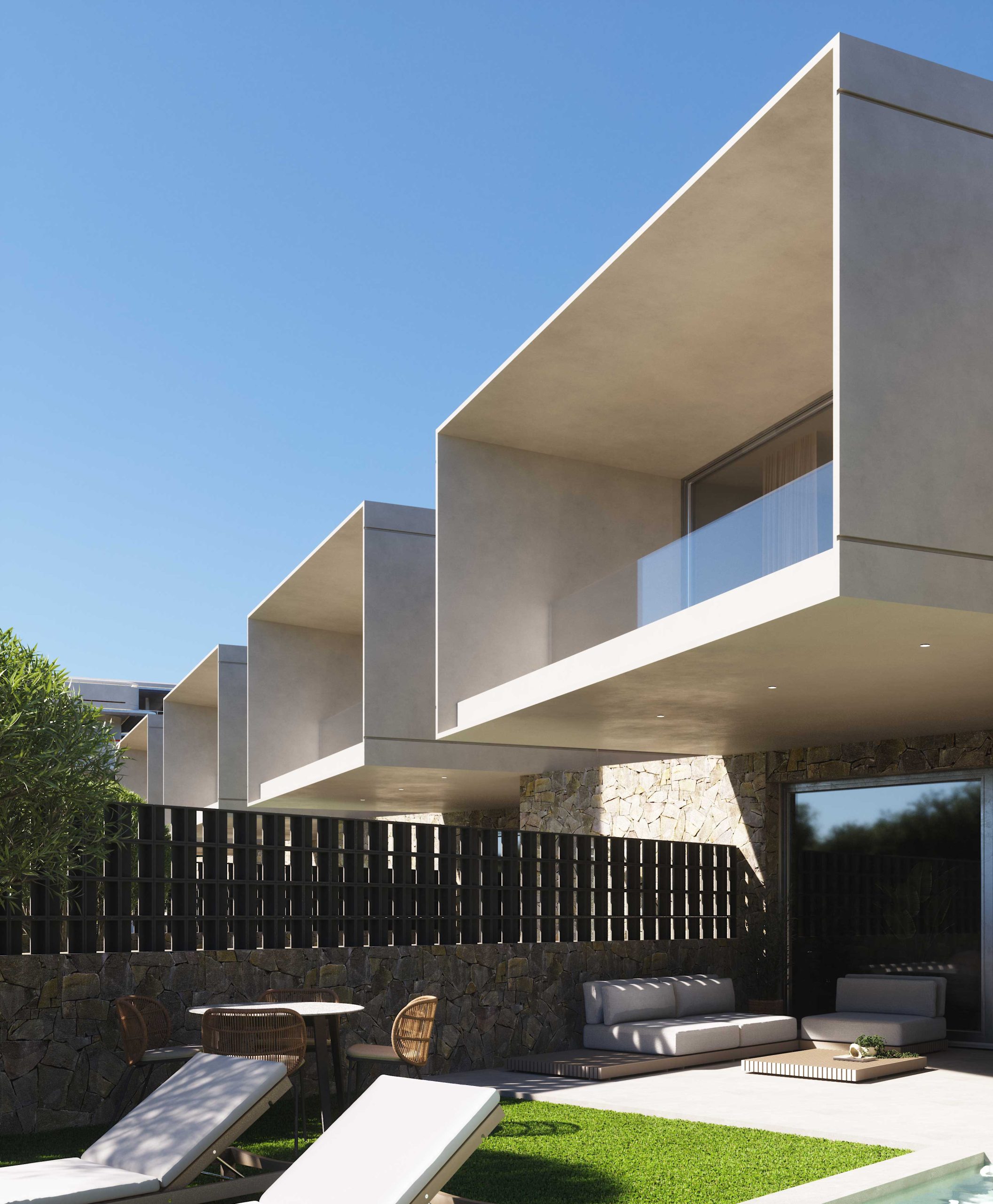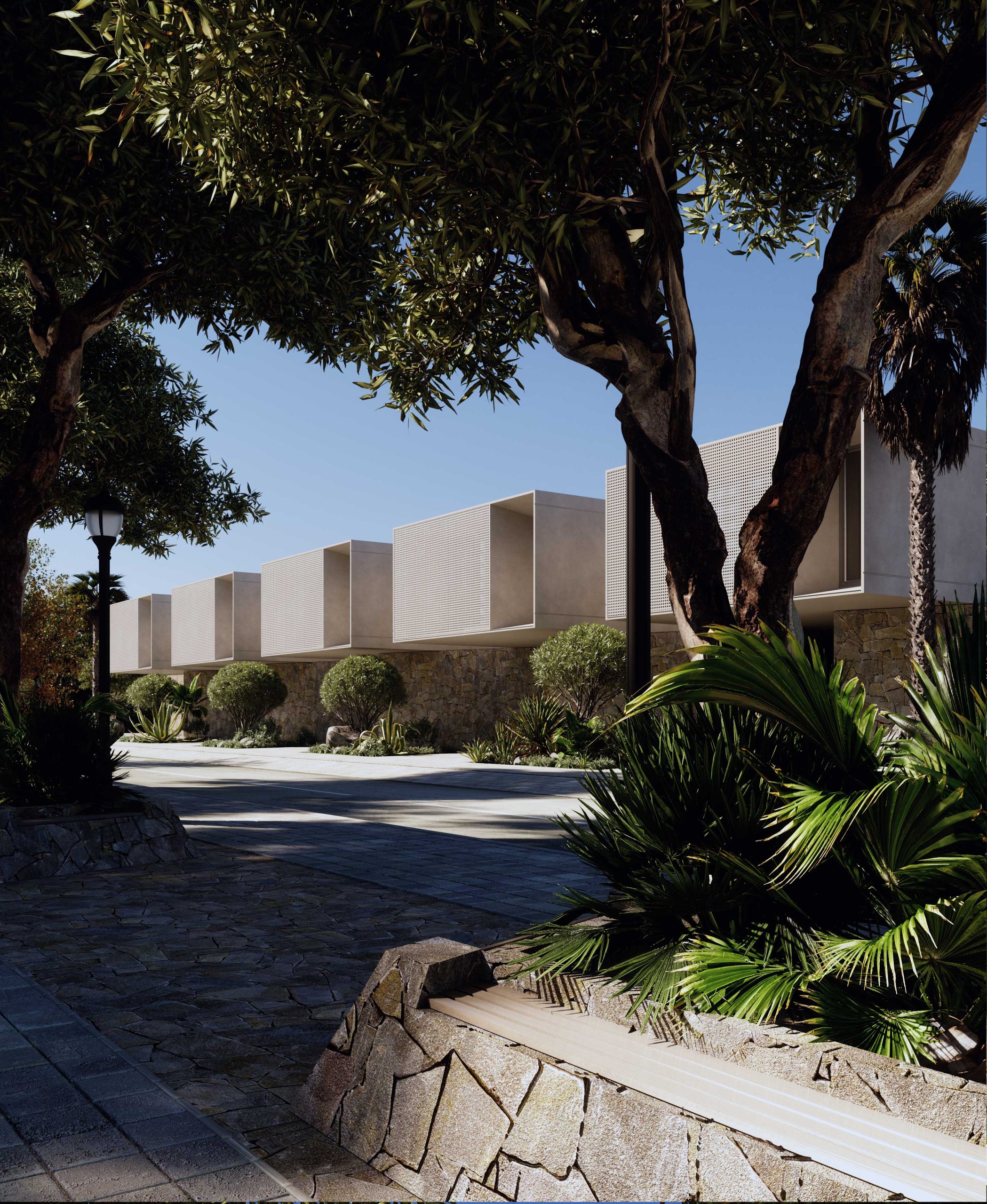 The project consists of a residential complex of five independent, two-storey houses with a minimalist design, arranged in a fragmented layout in Halkidiki, in close proximity to the sea. The ground floor of each dwelling is formed by inclined stone walls, which act as a solid base for the upper level. The upper floor is conceived as a clean, orthogonal volume that “rests” on the stone structure below, reinforcing the contrast between the heavy, earthy materiality of the base and the light, restrained geometry of the superstructure.