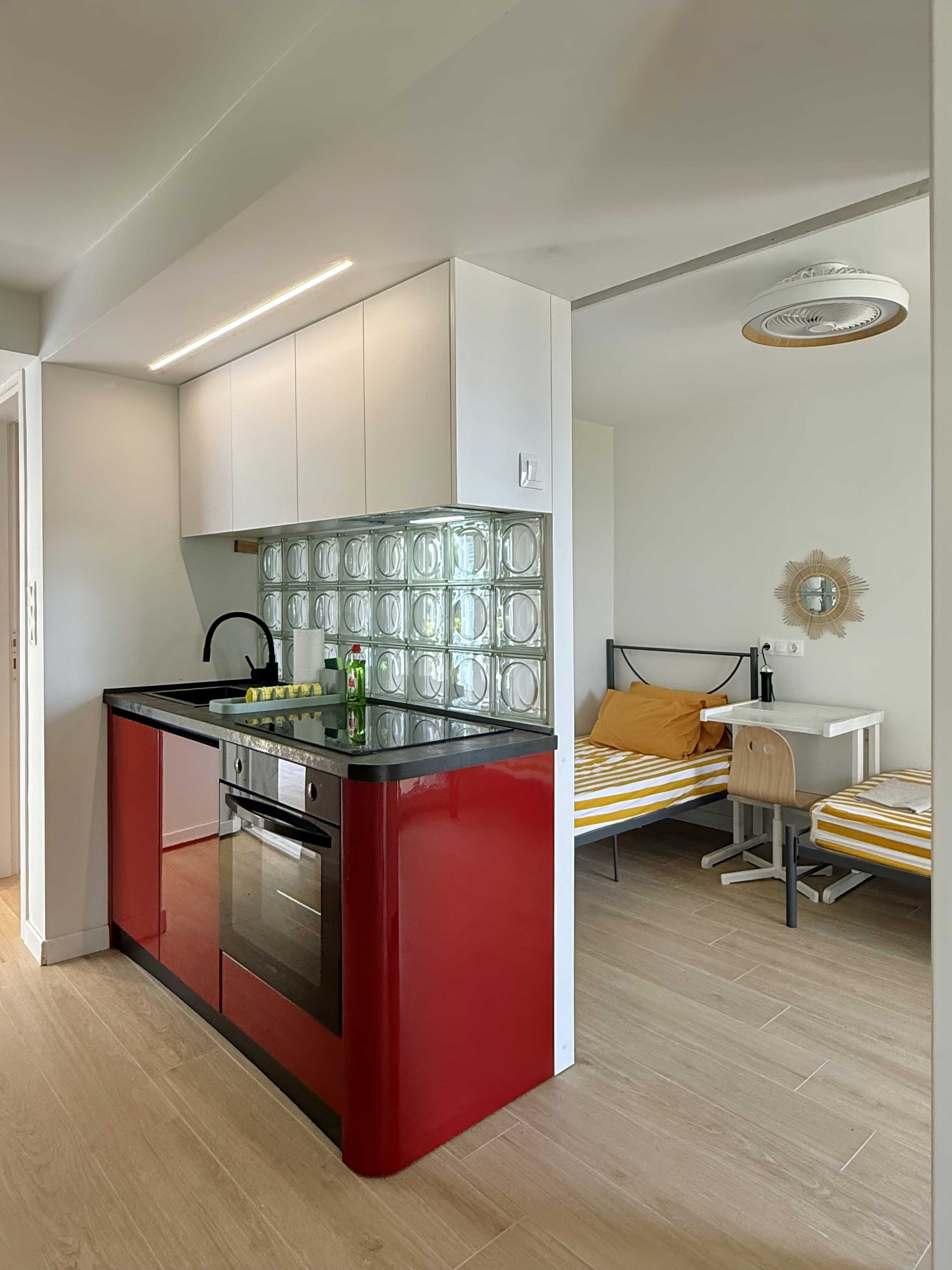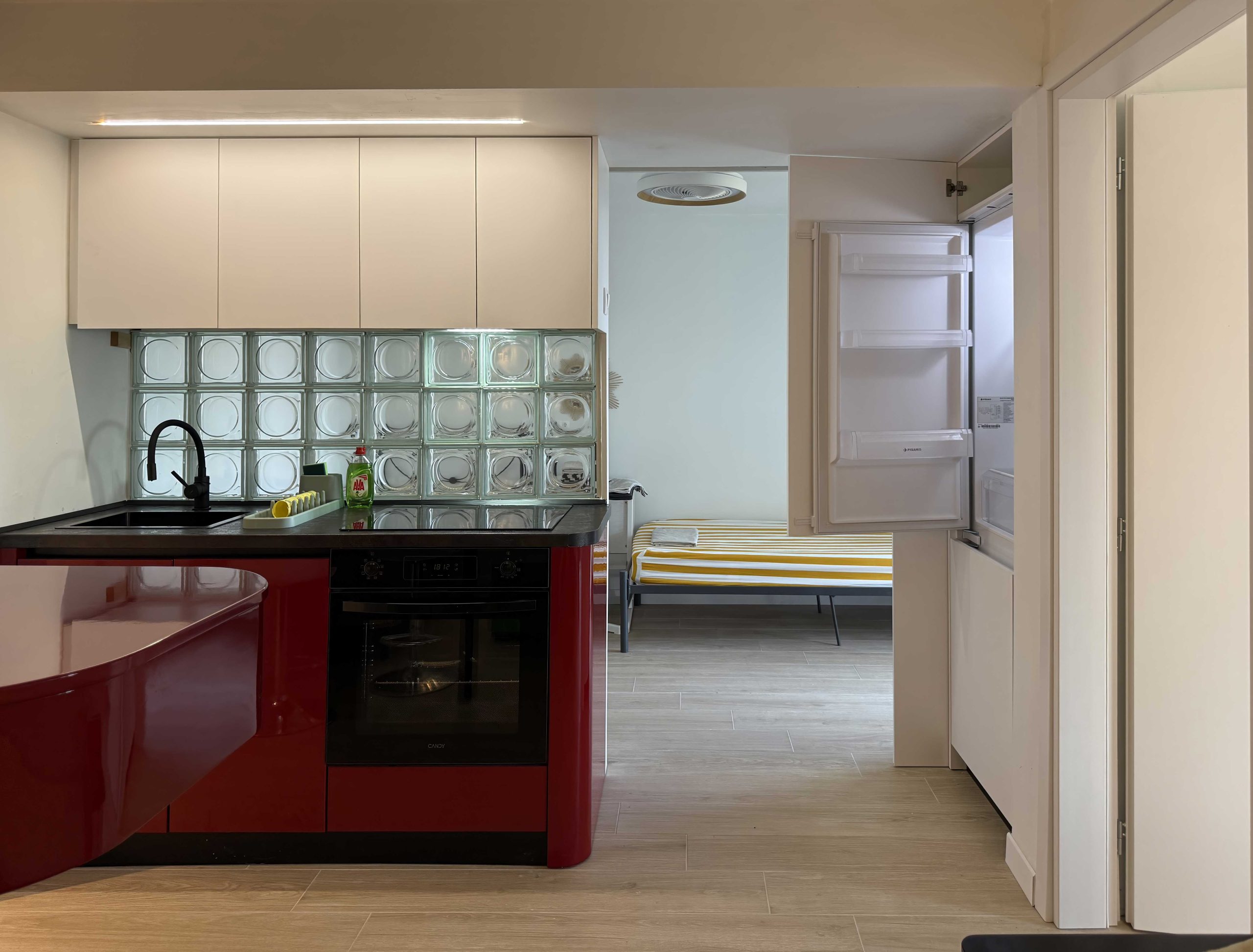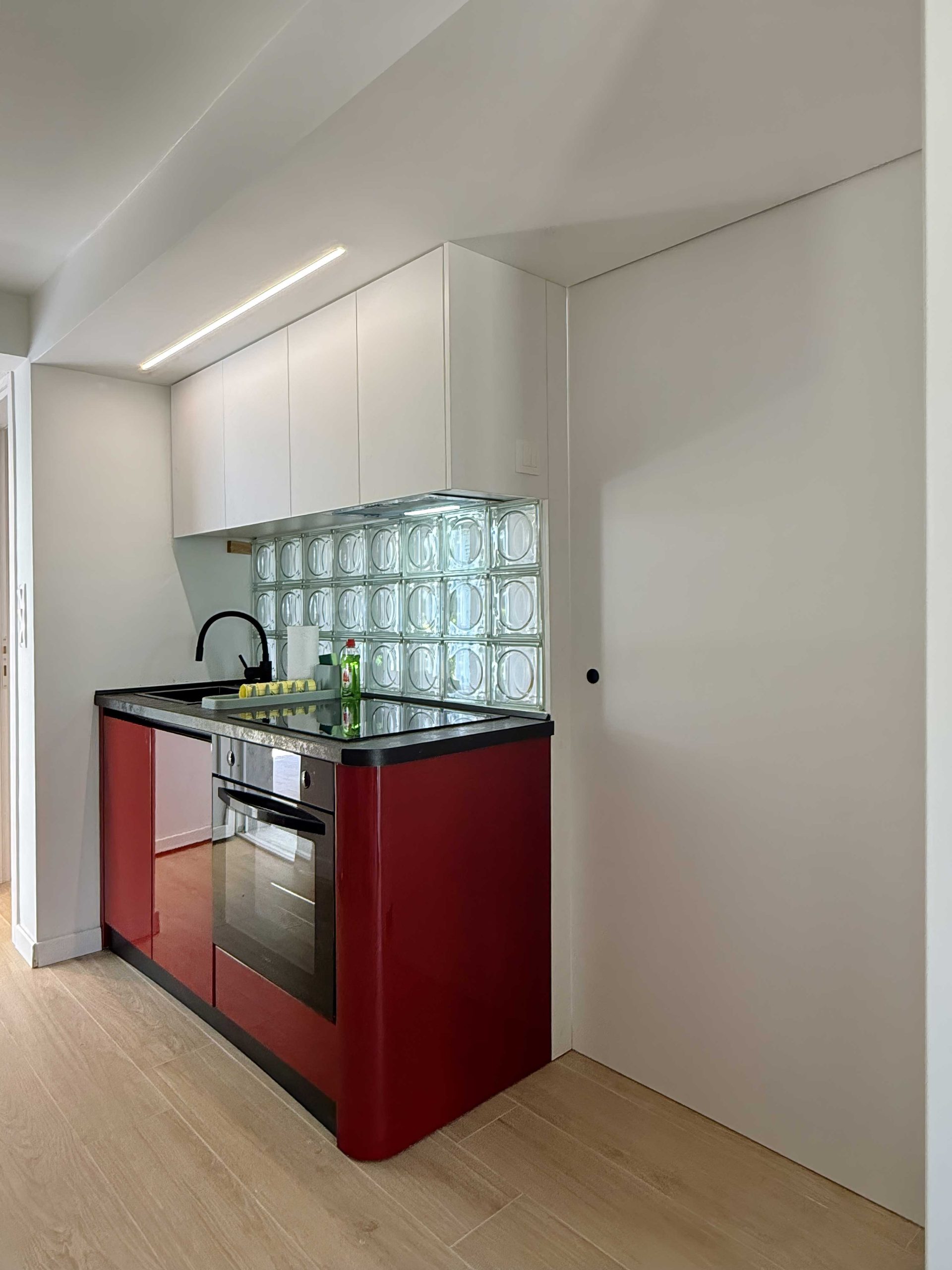 Standout features include the red kitchen with a glass brick backsplash, which also functions as a space divider, separating the double bedroom from the living area, and the distinctive “blue window” at the entrance, adding a playful and unexpected touch to the apartment’s entry space.