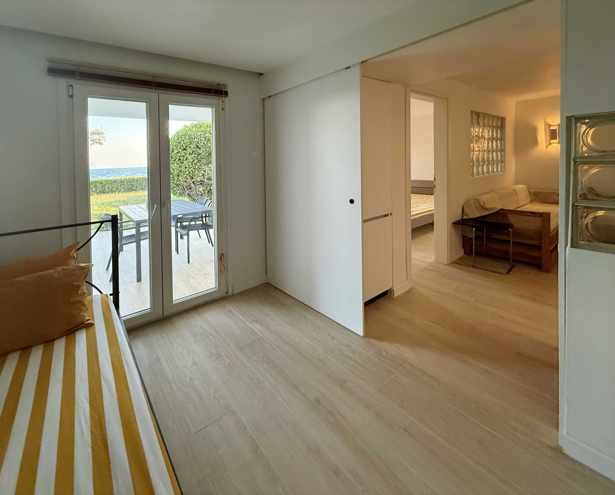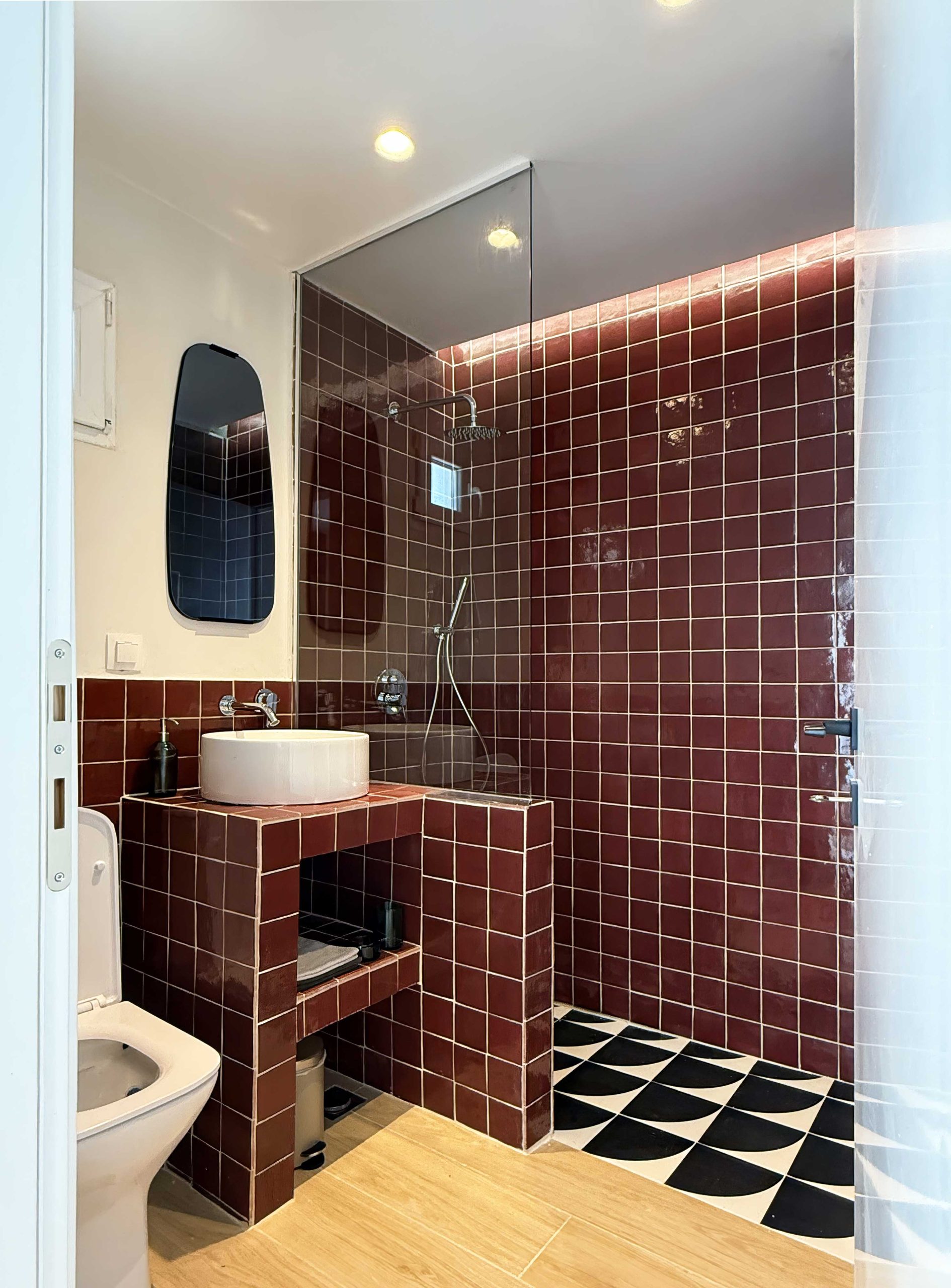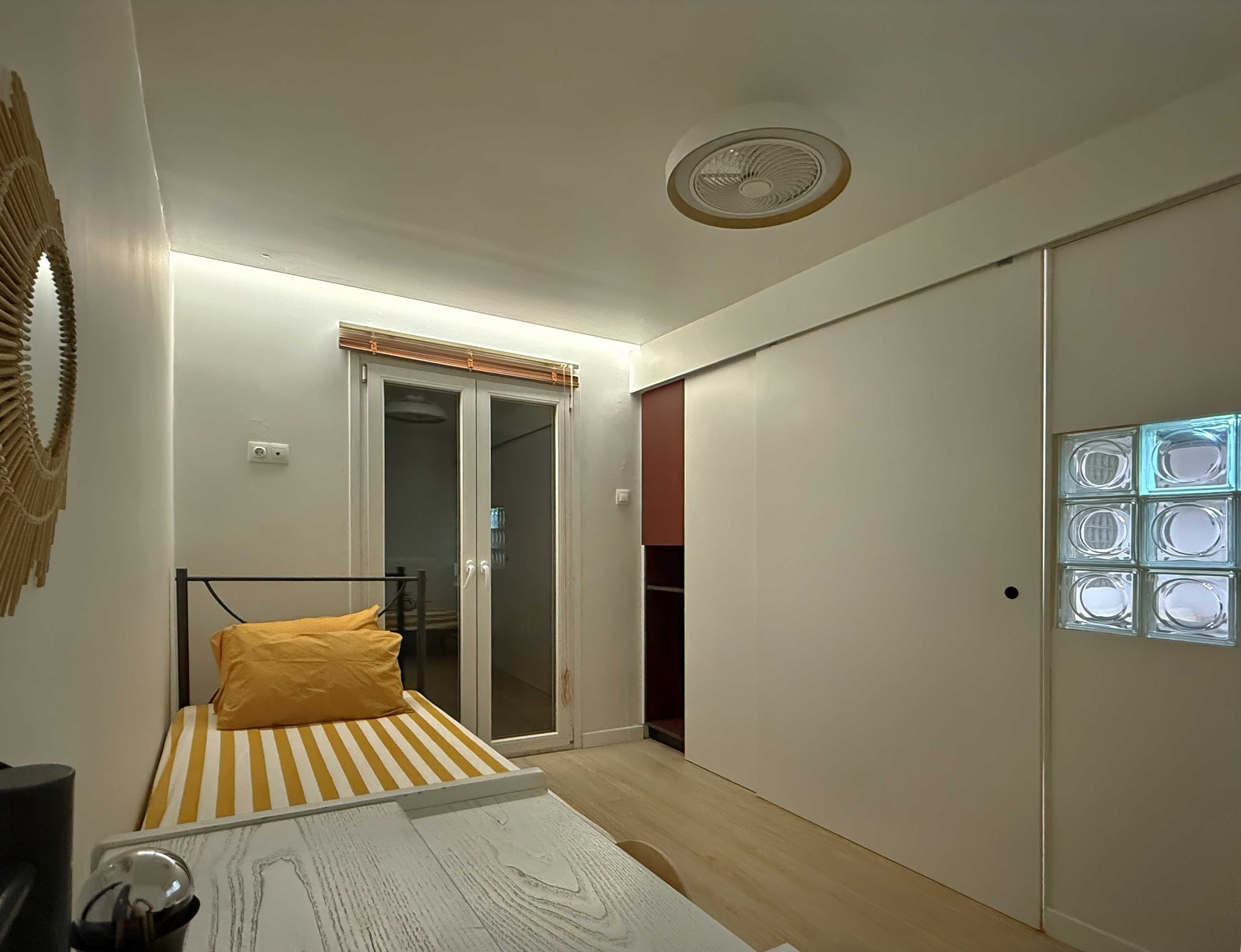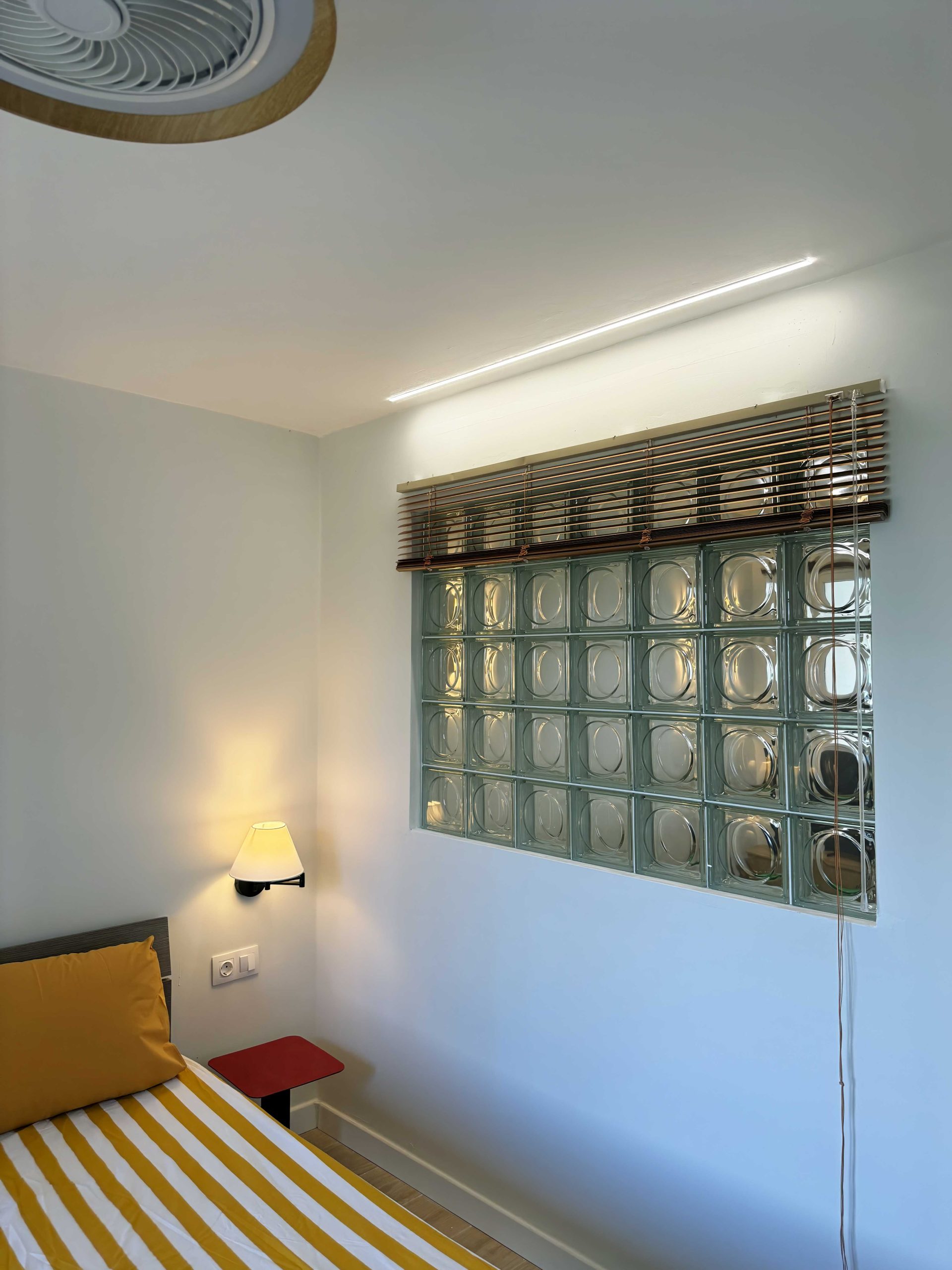 Standout features include the red kitchen with a glass brick backsplash, which also functions as a space divider, separating the double bedroom from the living area, and the distinctive “blue window” at the entrance, adding a playful and unexpected touch to the apartment’s entry space.